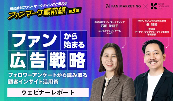 「ファンマーケティング=既存顧客へのアプローチ方法」と考えている企業様もいるのではないでしょうか?しかし、実際にはファンの声を広告に活かすことで、より顧客に刺さる広告作りができるようになり、新規顧客獲得を効率的に行うことが可能です。 株式会社ファン・マーケティングでは、Web広告に強みを持つKURO HOLDINGS株式会社様とともに、オンラインセミナー『ファンから始まる広告戦略~アンケートから読み取る、顧客インサイト活用術~』を2025年8月21日に開催いたしました。今回は、その内容を踏まえて、顧客インサイトの抽出方法と活用術について詳しく解説します。